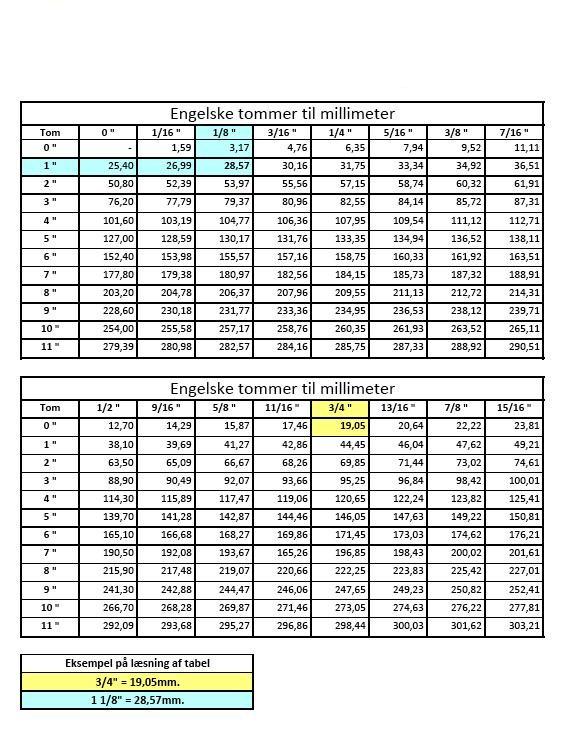 Omsætning af engelske Tommer til Millimeter