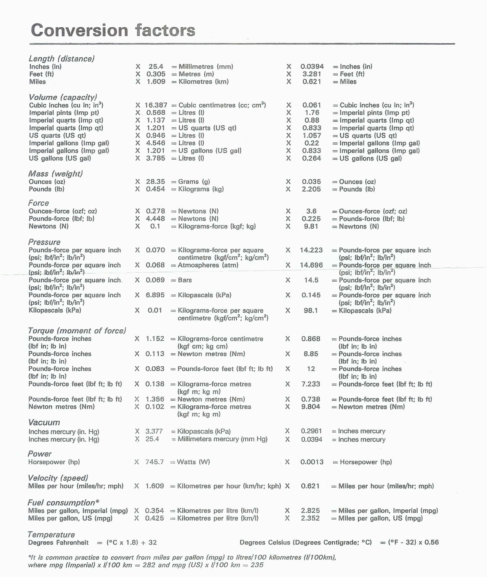 Omregnings tabel